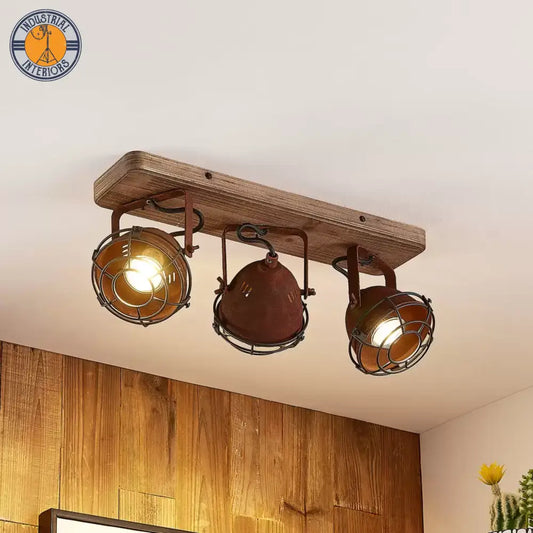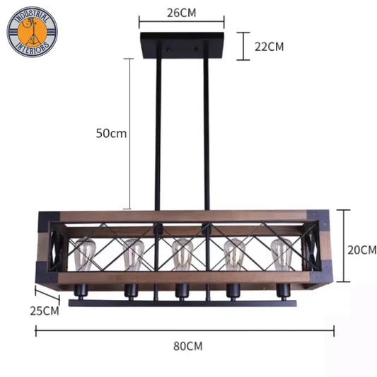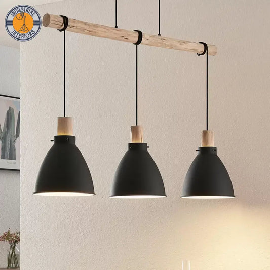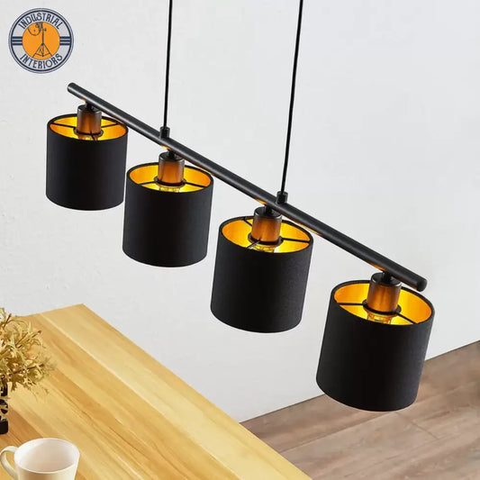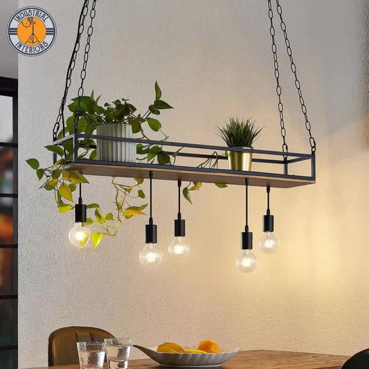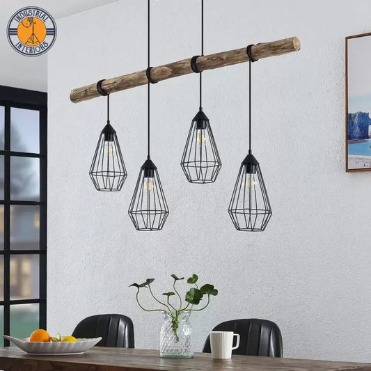 Industrial 4-Bulb Hanging Light with Wooden Beams